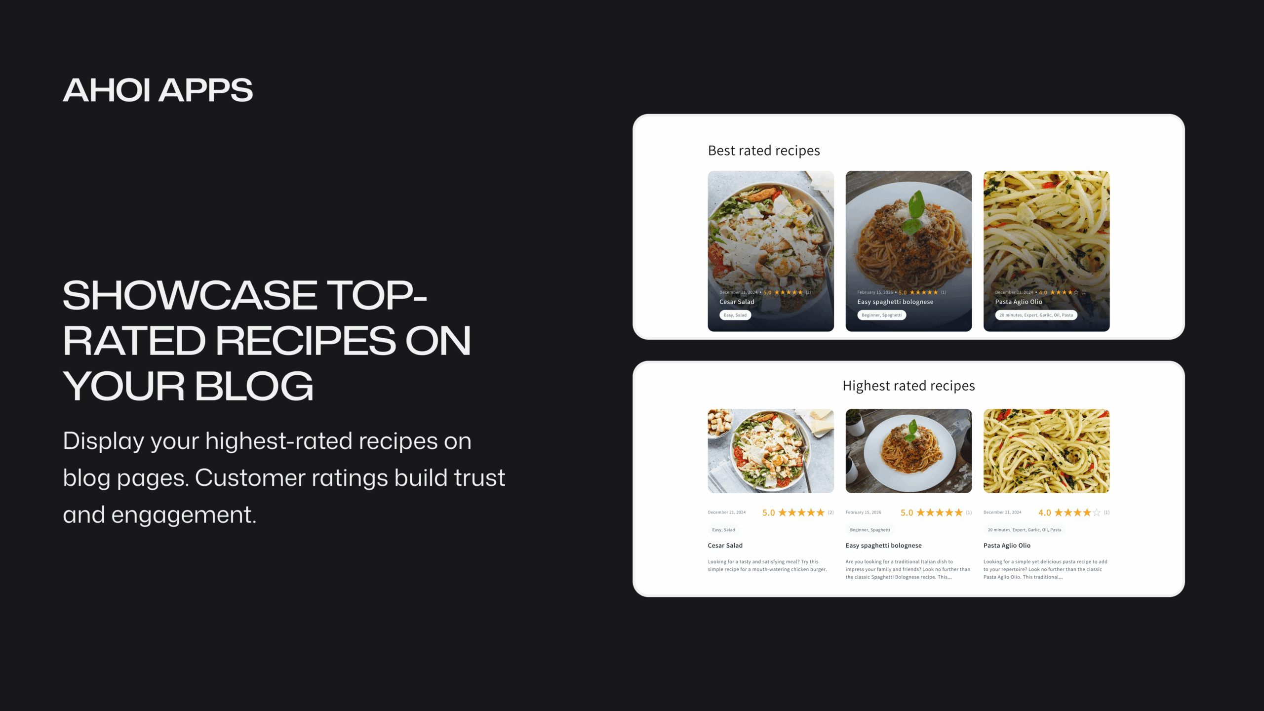 Highest-Rated Recipes Section Automatically surface your top-rated recipes in a dedicated section on your blog. Showcase your best content to new visitors and reward the recipes that your community loves most.