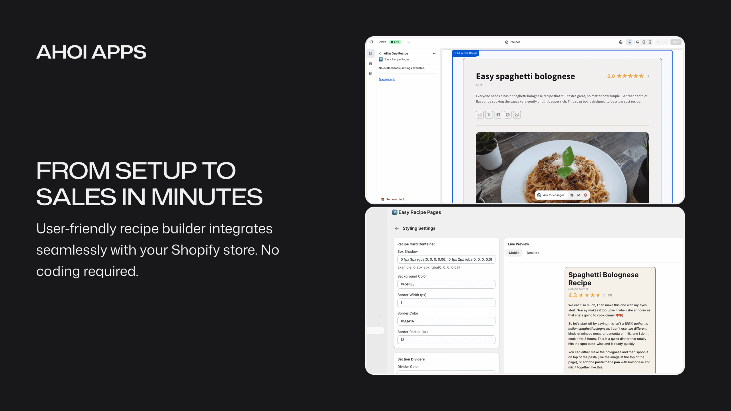 1. Install the App Install Ahoi Apps – Easy Recipe Pages from the Shopify App Store. No code changes required. The app integrates as a native Shopify theme section.