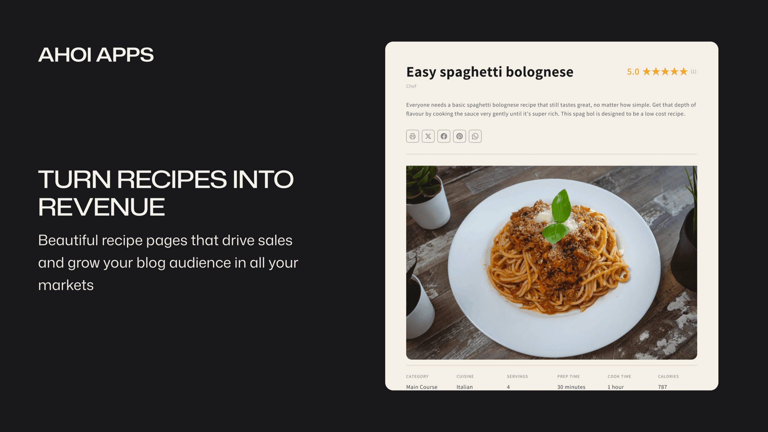 A Shopify recipe app lets you add structured, SEO-optimized recipe pages directly to your Shopify blog. With Ahoi Apps – Easy Recipe Pages, you can publish recipes complete with ingredients, step-by-step directions, nutrition facts, embedded videos, customer ratings, and automatic Google schema markup — all without writing any code.